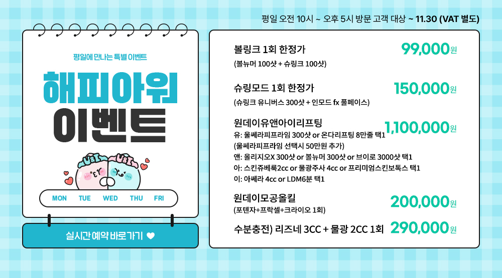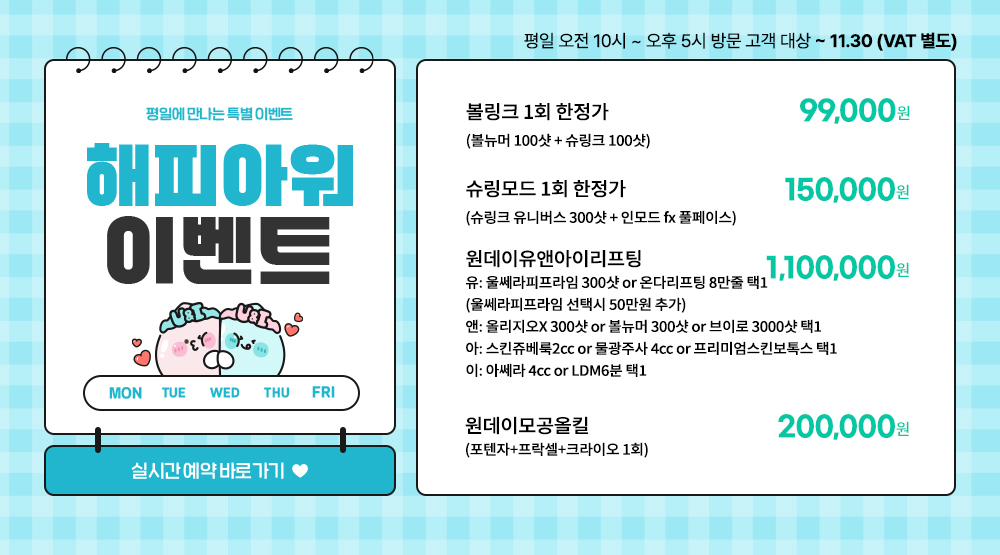 유: 울쎄라피프라임 300샷 or 온다리프팅 8만줄 택1 (울쎄라피프라임 선택시 50만원 추가)