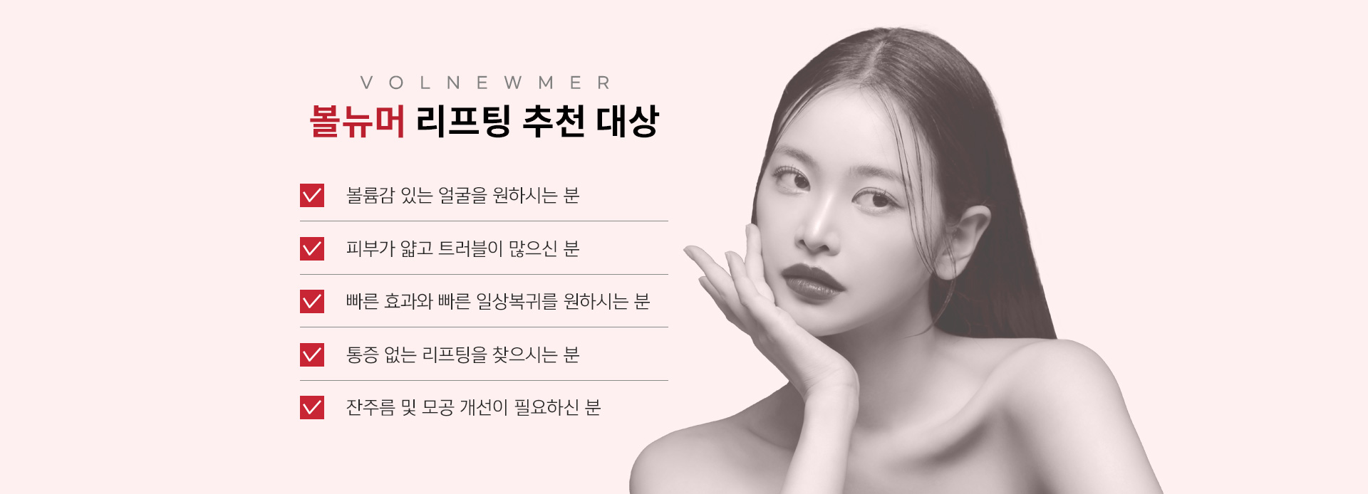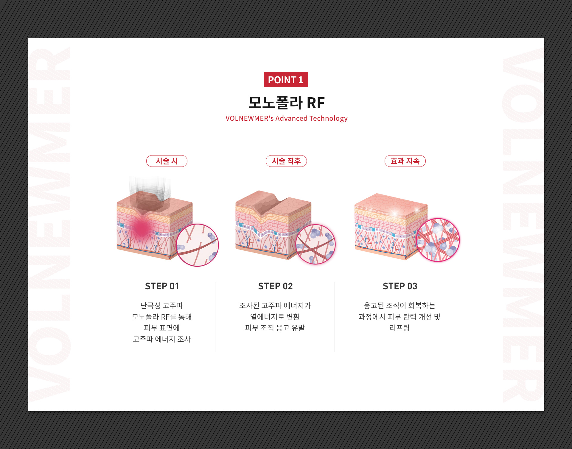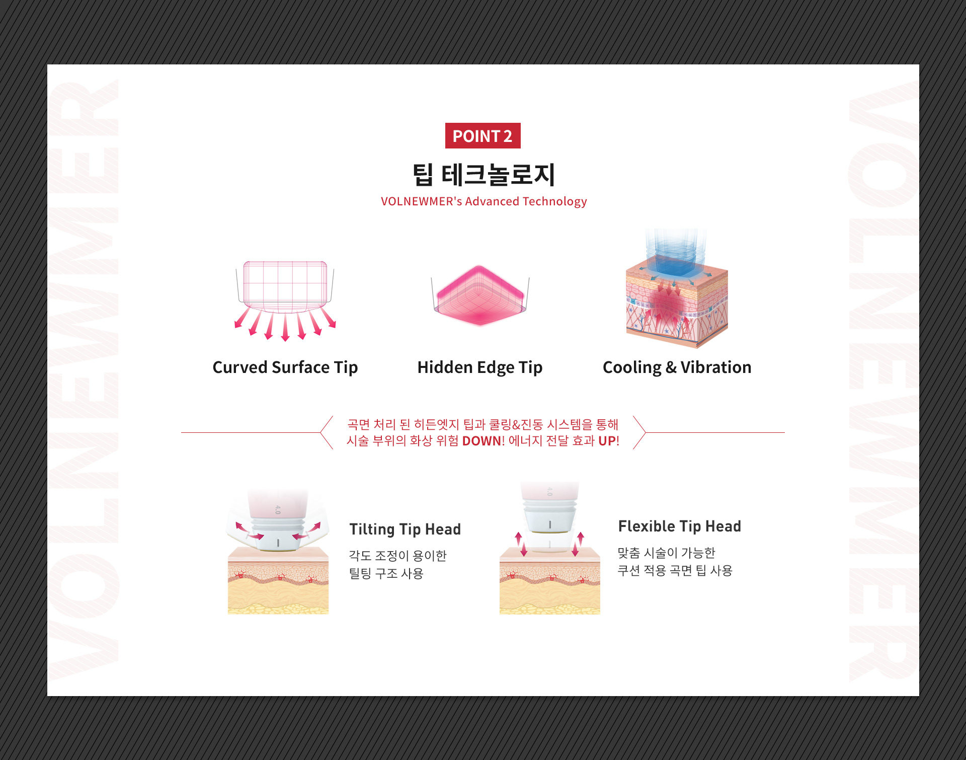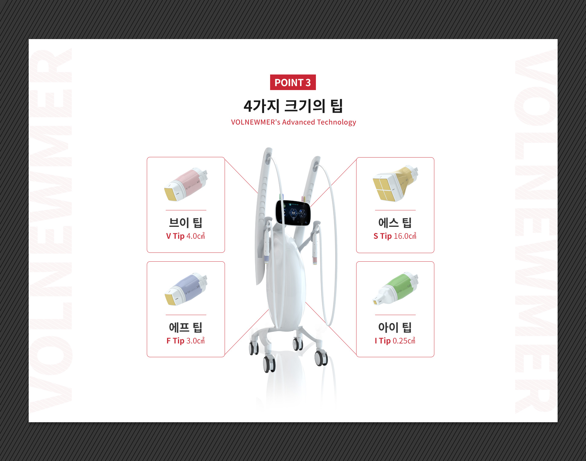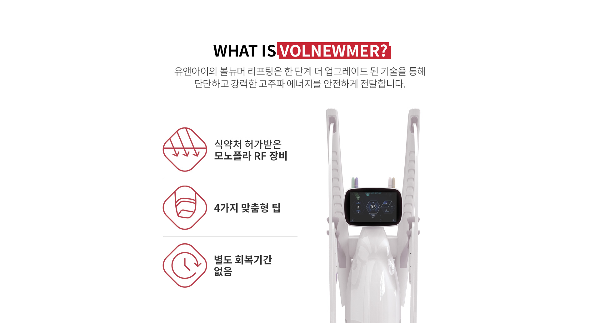볼뉴머는 모노폴라 RF를 통한 고주파 리프팅으로 4가지 맞춤형 팁으로 정교한 시술이 가능합니다.